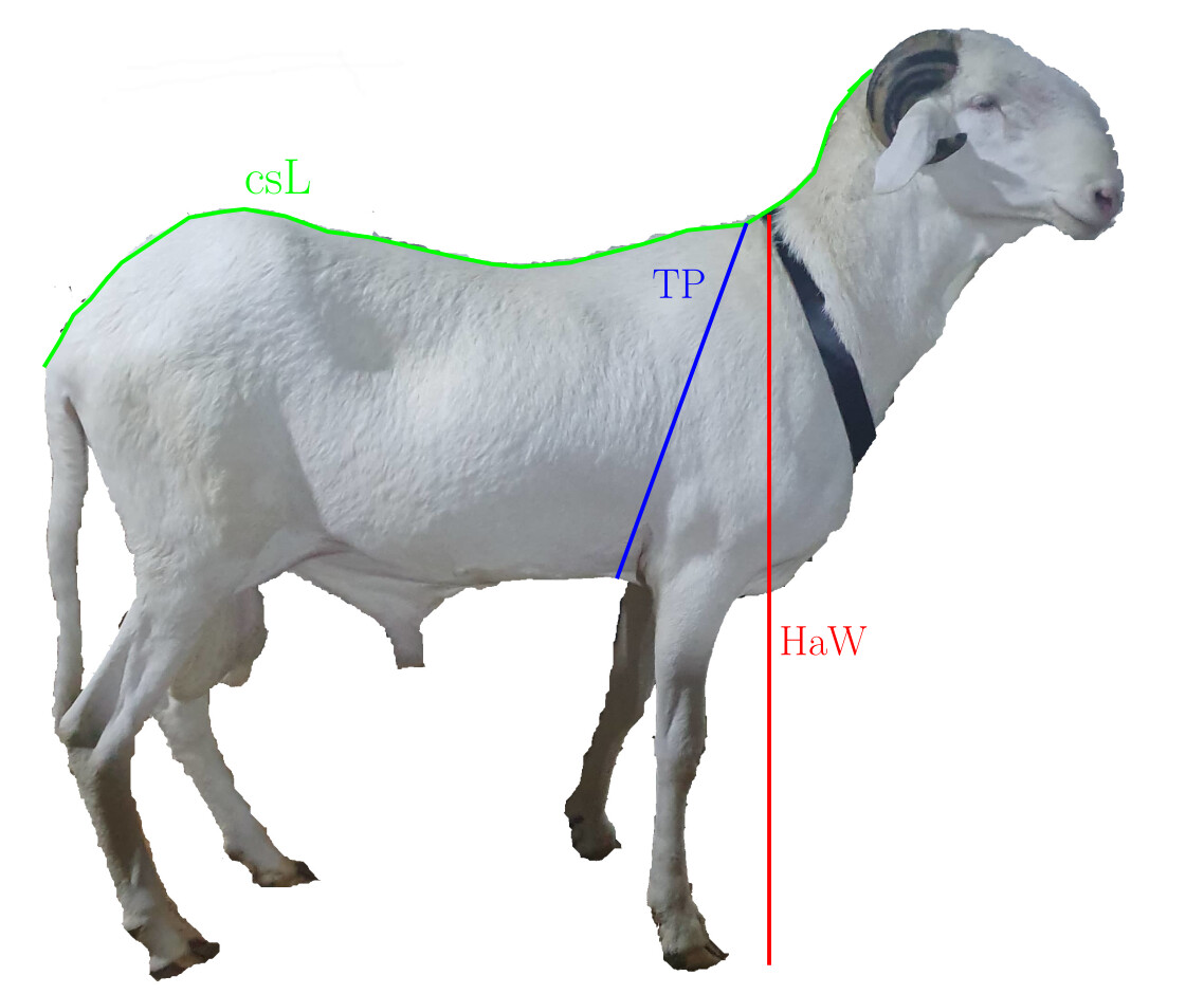 Cervico sacral Length [csL], thoracic perimeter [TP], height at withers [HaW], and liveweight [LW]